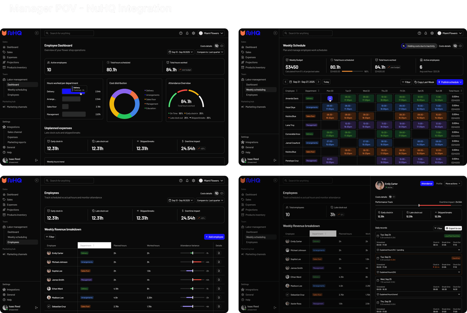 Real-hours visibility: NuHQ displays scheduled vs. actual hours, flagging late check-ins, skipped breaks, or overtime.